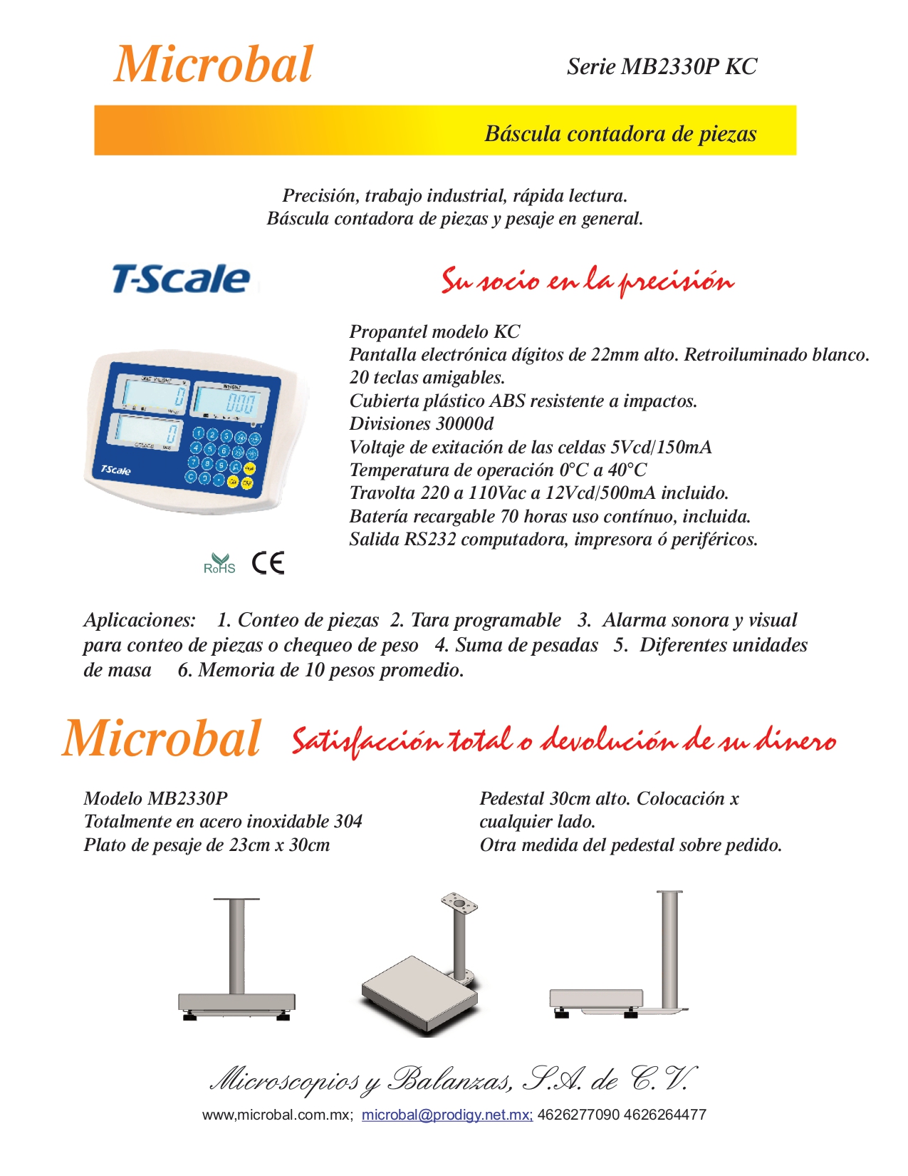 •Modelo Capacidad División (d) Peso bruto aprox. Plato de pesaje •MB2330P KC 3 3000g 0.1g 5kg 23cmx30cm •MB2330P KC 6 6000g 0.2g 5kg 23cmx30cm •MB2330P KC 15 15000g 0.5g 5kg 23cmx30cm •MB2330P KC 30 30000g 1g 5kg 23cmx30cm