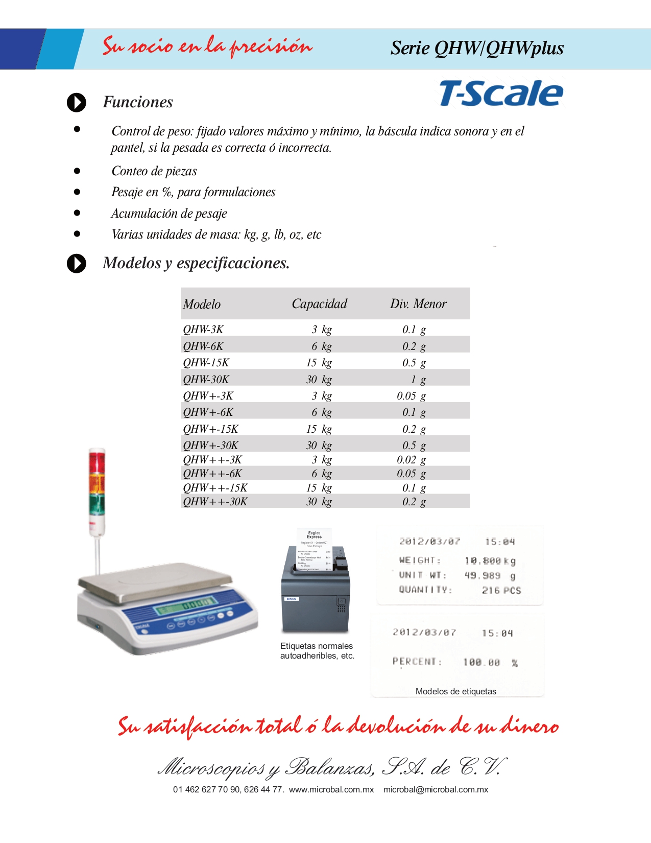 • Impresora de etiquetas adheribles ó rollo continuo • Semáforo verde, rojo y naranja para control de peso pasa ó no pasa • Interfase RS232 para conexión a computadora, impresora o hoja de cálculo